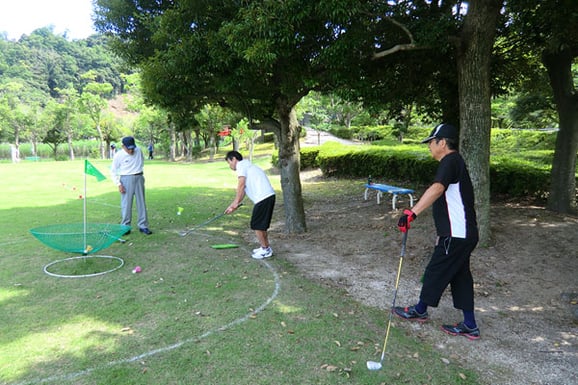 傘を逆さにしたようなホールへ入れるミニゴルフの一種です。